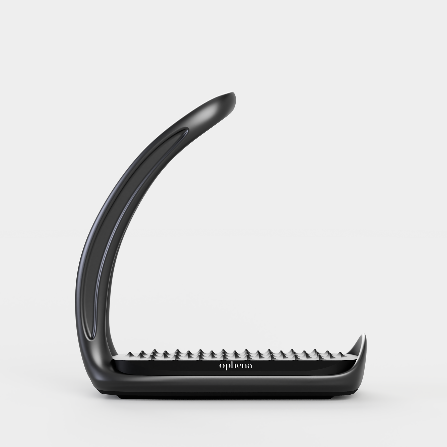 Side view of the magnetic safety stirrups Ophena S in color Onyx Black with Pro Grip. In particular showing the stirrup's unique open design, which is an essential safety feature.